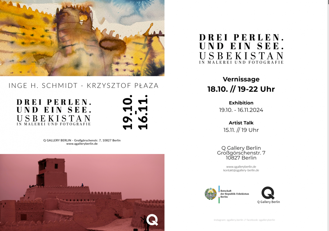 QGallery presents from 18th October 2024 the exhibition “THREE PEARLS AND A LAKE. UZBEKISTAN in painting and photography”. In this double exhibition, artist Inge H. Schmidt and photographer Krzysztof Płaza will be showing their works created during t