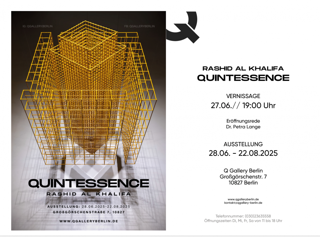 QUINTESSENCE/ 28.06.2025 - 22.08.2025. The Q Gallery Berlin is pleased to present the exhibition Quintessence by Rashid Al Khalifa, opening on 27.06.2025 at 7 p.m. This marks the first time the striking installations of the Bahraini artist are on v