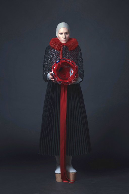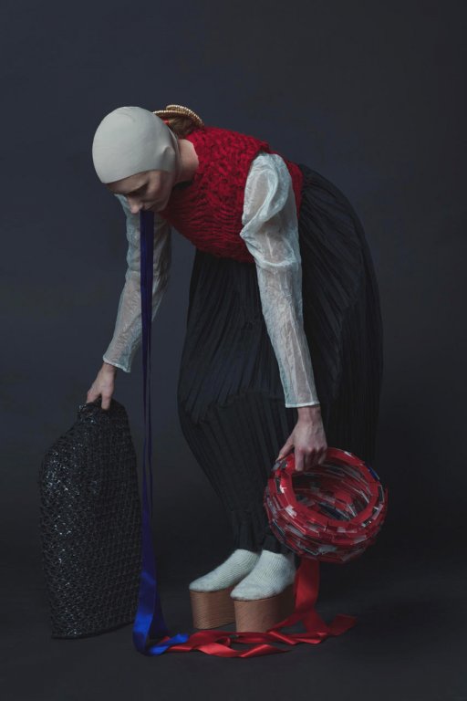 hiago Auge The image series Out of the Forest , created in 2019, deals with the with the visual landscape of the Black Forest, its nature and the clothing of its women, more precisely the rustic festive costume of the „Gutacherin" (the appraiser). This long anachronistic piece of clothing is considered the Black Forest costume par excellence and with its most distinctive element, the red "Bollenhut" (pom-pom adorned hat), has become synonymous with this cultural landscape. Its original symbolism and transformative power was almost completely buried in the process: The traditional costume signaled geographical affiliation to a particular community and within this community it took on the function of a language that overlaid the individual person with the vocabulary of social codes. The festive costume, also known as the "dress of honor", "church dress" or "forest dress", was given to the wearer when she joined the congregation and accompanied her for the rest of her life. Until her death, it provided information about the woman’s identity and home. The "forest dress" had three layers, one white, one red and one black, which were worn on top of each other and thus changed the silhouette of the wearer. In Out of the Forest special attention is paid to these three layers in particular. In the image series Out of the Forest , Kerstin Grießhaber explores her place of origin, the Black Forest. Over the years she has documented traditional church festivals such as Easter, Thanksgiving and the associated processions in the Black Forest. The tradition of the Black Forest costume awakened in her the imagination for her own artistic language and a contemporary translation of those historic techniques and materials associated with the objects of her research. She interviewed local people who still master this highly specialized craft. Her artistic career as a costume designer shaped her understanding of clothing, textile and craftsmanship. For the artistic process time and duration of the production of those individual pieces of clothing play a significant role. All visible objects and textiles were elaborately produced and crafted by Kerstin Grießhaber herself: from the headpiece and clothing to the shoes of the person portrayed. Thiago Auge's gaze brings the Out of the Forest series to life. Since 2011 Kerstin Grießhaber has had her works photographed with Sophie Reble.
