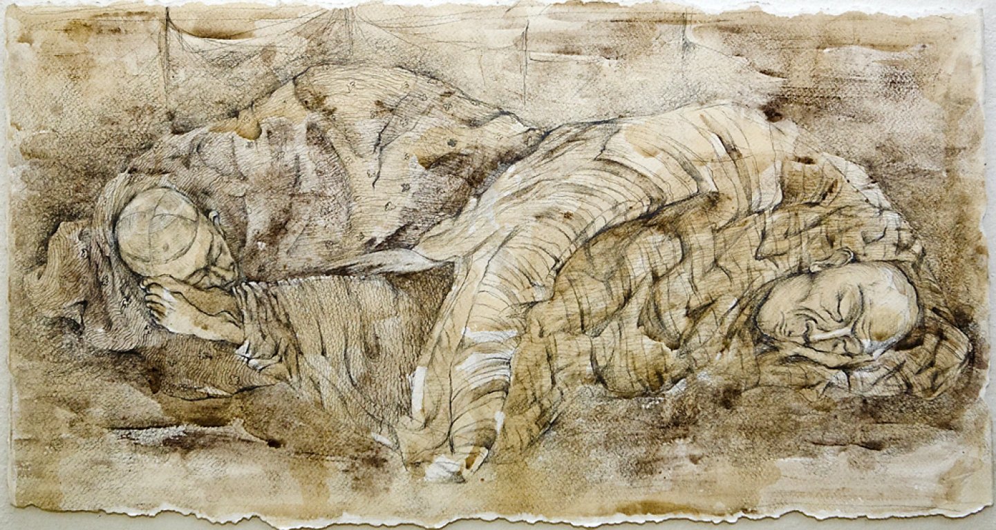 casual graphic, sometimes as objects of an installation or in photographs. Also her homeland Uzbekistan often plays a role in her paintings. The work "Listen to the silence of the lost sea" is dedicated to the women of the desiccated Aral Sea.