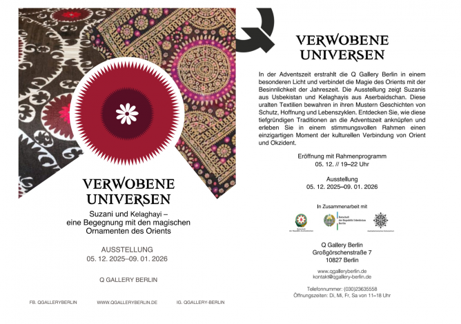 The exhibition ‘Threaded Universes’ presented magnificent suzanis from Uzbekistan and filigree kelaghayis from Azerbaijan. These ancient textiles carry stories of protection, hope and the great cycles of life in their patterns – and at the same time wonderfully tied in with the symbolism and atmosphere of the Advent season.